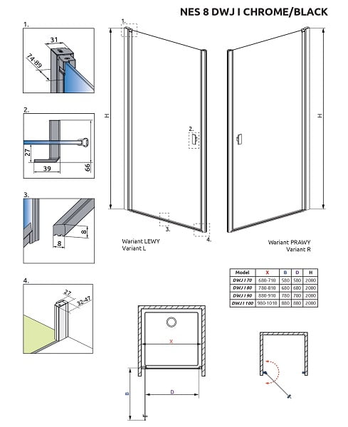 Колекція Nes це одна з найбільш універсальних і різноманітних колекцій душових кабін, дверей і шторок. Стулки двері в цій колекції відкриваються і всередину і назовні. Профілі і фурнітура на вибір або в кольорі «хром», або«Black». Товщина скла 6 або 8 мм. За стандартом скло прозоре або Frame / Factory. Під замовлення є доступні інші варіанти кольорів стекол.