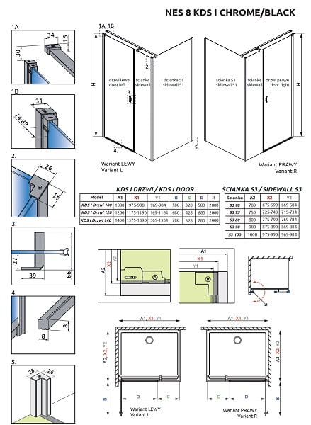 Колекція Nes це одна з найбільш універсальних і різноманітних колекцій душових кабін, дверей і шторок. Стулки двері в цій колекції відкриваються і всередину і назовні. Профілі і фурнітура на вибір або в кольорі «хром», або «Black». Товщина скла 6 або 8 мм. За стандартом скло прозоре або Frame / Factory. Під замовлення є доступні інші варіанти кольорів стекол.