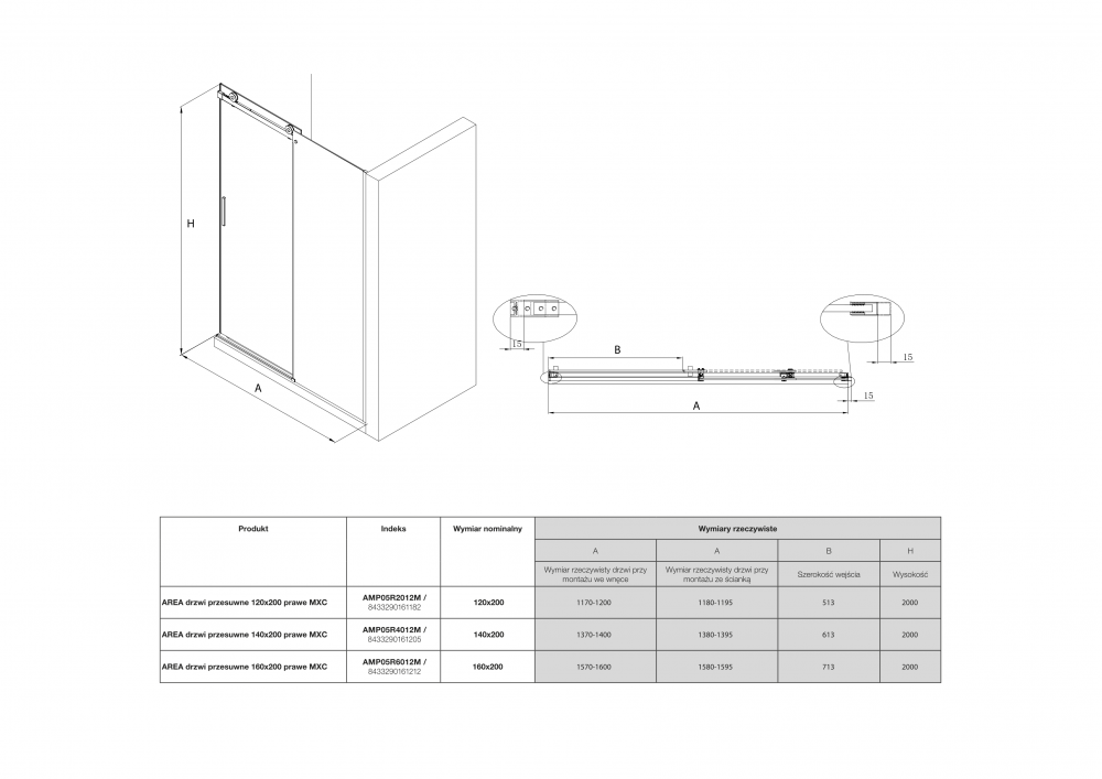 1) Душові двері Roca Area розсувні права 140х200 см прозоре скло