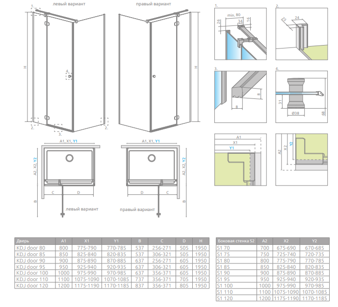- Необхідна комбінація: з двостулковими дверима потрібного розміру (80-120 см) -01R, 133215-01-01L, 133211-01-01R, . Якщо розмір бічної стінки ≥ 1000 мм, кабіна отримає хрестоподібний стабілізатор.