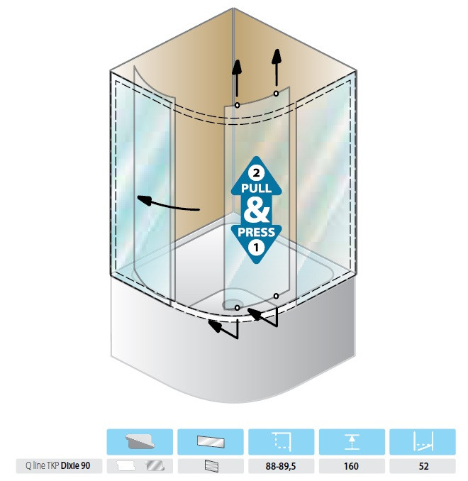 Напівкругла душова кабіна Kolpa San SQ Line Dixie TKP90 / CH зі знімними дверними стулками для душового піддону "Діксі". Душова кабіна оснащена шарикоподшипниками, що полегшують її очищення.