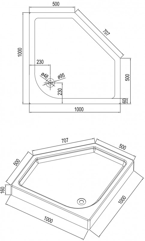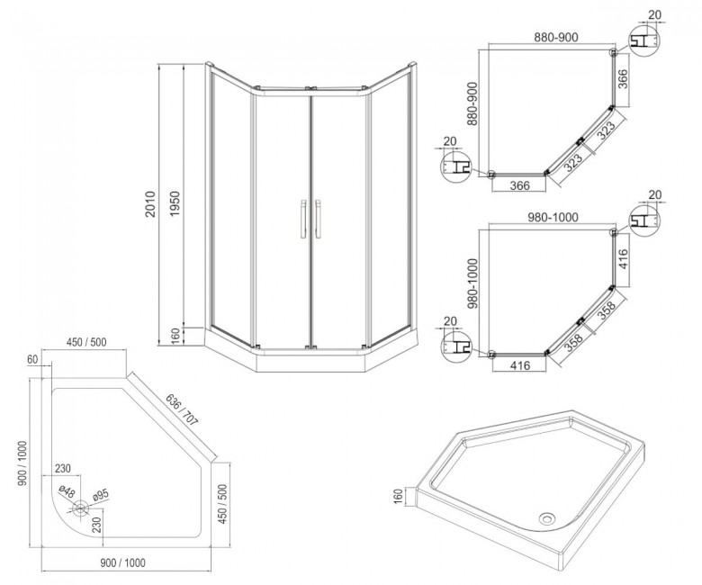 Представлена модель п'ятикутної, розсувний душової кабіни з універсальним розташуванням 599-142 серії Iris від Eger, має розмір 201 x 90 x 90 см, виконана з розжареного прозорого скла з хромованим алюмінієвим профілем і поставляється з акриловим піддоном висотою 16 см.