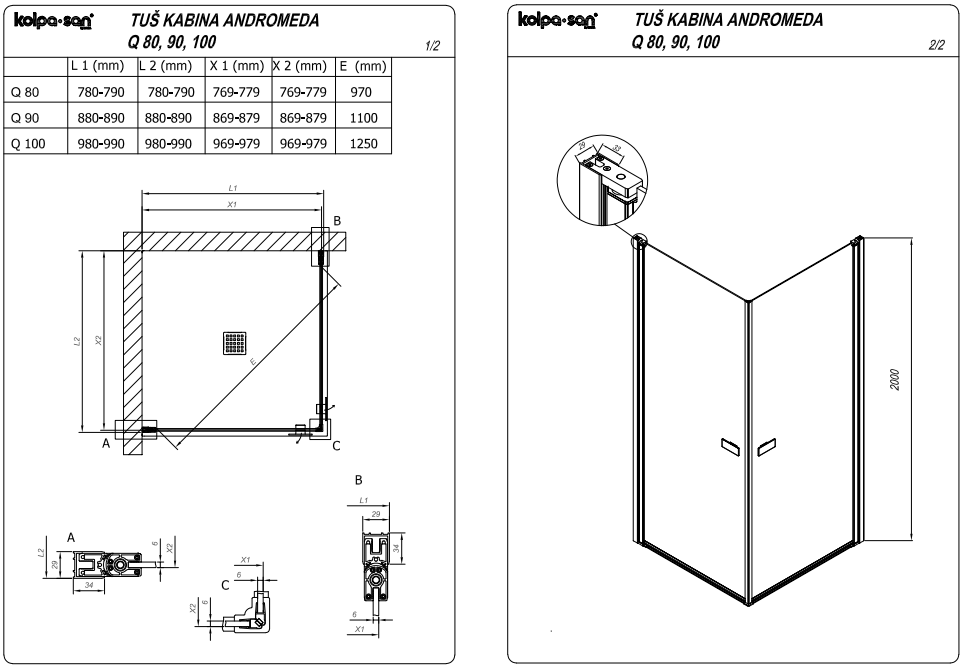 1) Душова кабіна Kolpa San Andromeda Q B 100х100 см профіль чорний/прозоре скло Clean Coat