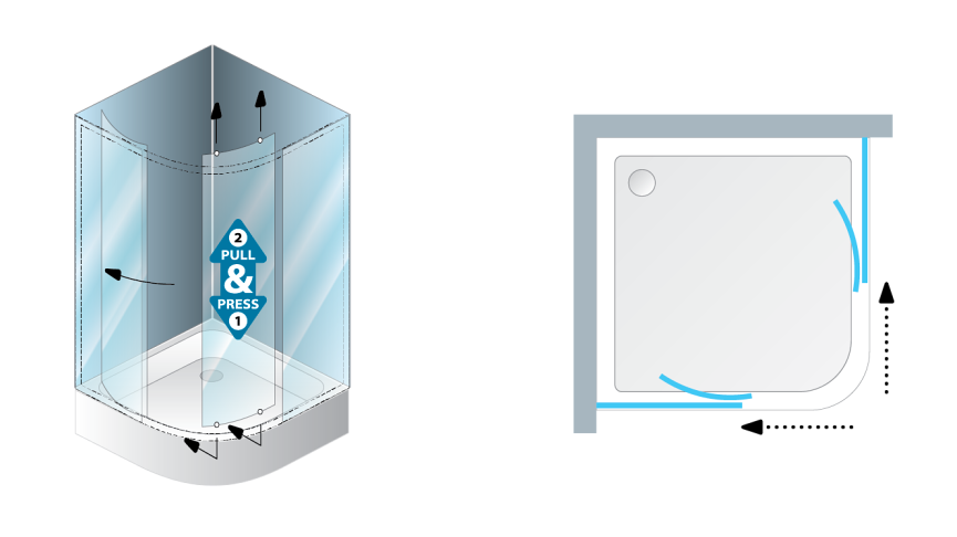 Нижня знімна напрямна і легко знімаються дверні стулки полегшують прибирання. Душові кабіни включають різні варіанти відкривання дверей для кращого надання послуг вашої ванної кімнати.