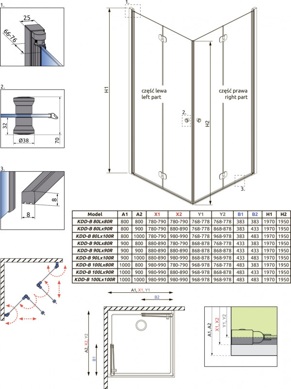 Модель Eos KDD-B — частково обрамлена душова огорожа (куточок) із чотирма скляними стулками. Маятникові двері, що складаються, з можливістю повороту на 90° назовні і всередину з боку настінного шарнірного профілю і на 180° назовні з боку шарнірних петель.