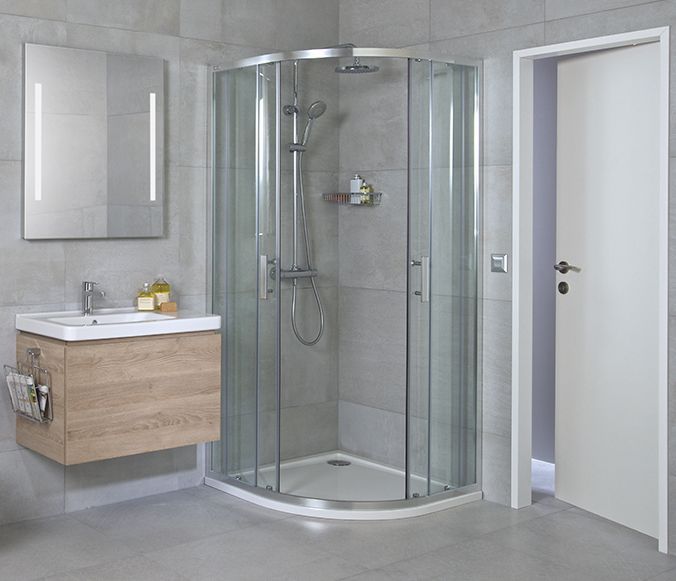 Душова кабіна втілює в собі новітні тенденції в меблів для ванних кімнат, а саме дивовижну простоту. Радіус 54 см, висота 195см, блискучі профілі і висувна система, скло товщиною 6 мм, прозоре абоарктичному декорі, хромовані двосторонні ручки, розсувні система. Обробка поверхні скла Jika Perla полегшує очистку і продовжує термін служби. Алюмінієва рама. Підшипники для легкого відкривання і закривання. Магнітні стрічки забезпечують ідеальну герметичність. Протестовано за 20 000 циклів.