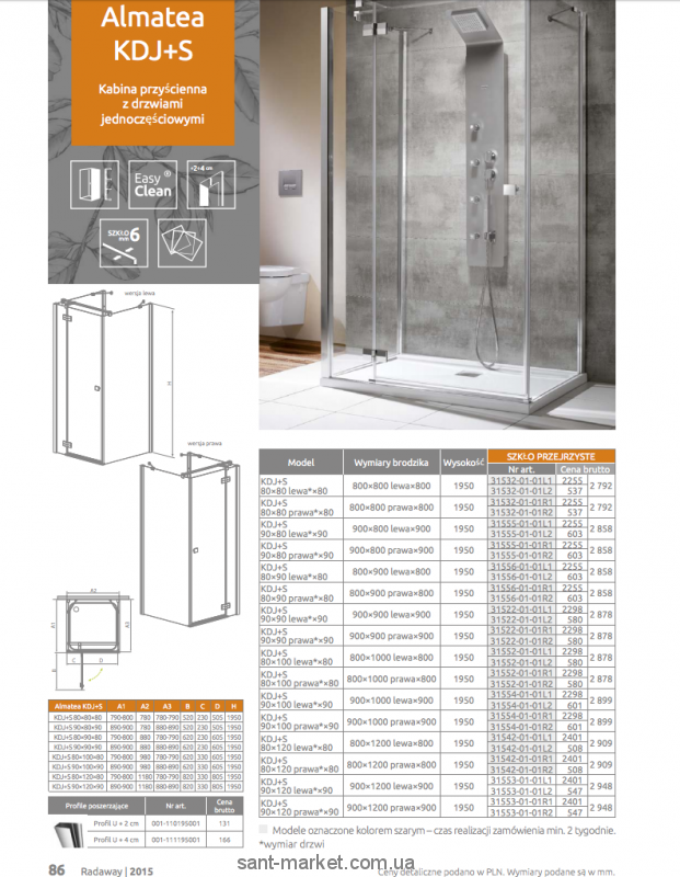 Душеві куточки Radaway Almatea KDJ+S створювалися з думкою про клієнтів, які цінують простоту і відповідно до актуальних ринкових тендерів. Завдяки з'єднанню великих листів скла та хромованих петель вдалося отримати легкість конструкції. Петлі оснащені підйомним механізмом. Вхід у куточок Radaway Almatea KDJ+S широкий та зручний. Скло має у стандарті покриття Easy Clean, яке запобігає осадженню каменю та інших забруднень на склі. Особливу увагу варто звернути на висоту куточка Radaway Almatea KDJ+S – 195 см. Завдяки цьому кабіни добре виглядають на низьких піддонах. Рекомендовані піддони: Paros C, Paros D, Rodos C, Siros C Compact, Delos C, Tilos D, Siros C. Ціна вказана за огорожу Almatea KDJ, бічна стінка Almatea S та душовий піддонпродаються як додаткова опція.