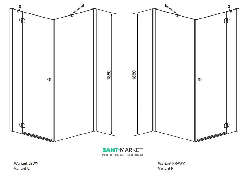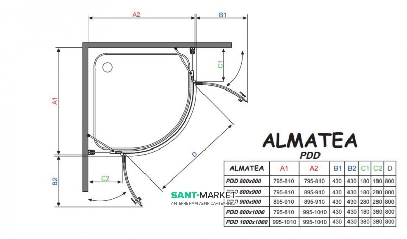 Кабіни серії Almatea дозволяється встановлювати як на піддони, так і безпосередньо на підлогу. Особливу увагу варто привернути до себе висоту кабіни – 1950 мм. Завдяки цьому кабіни добре виглядають на низьких піддонах. Квадратна кабіна з двостулковими дверима та вузькими бічними стінками. Двері відкриваються назовні кабіни створюючи широкий та зручний вхід. Двері підвішені на латунних, хромованих петлях з підйомно-опускним механізмом та системою позиціонування дверей. Кабіна доступна у правому та лівому варіантах.