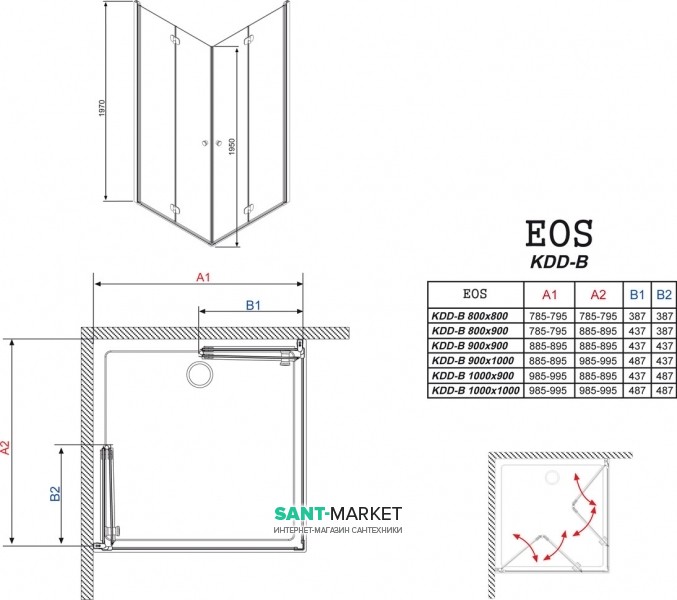 Прямокутна душова кабіна Radaway EOS KDD-B з складними дверима типу bi-fold (двері-гармошка) у розмірі 900×900 мм. Двері підвішені на профільних хромованих петлях, відчиняються всередину створюючи тим самим широкий і зручний вхід. Кабіна серії Eos можна встановлювати як на піддони, так і безпосередньо на підлогу з душовим трапом.
