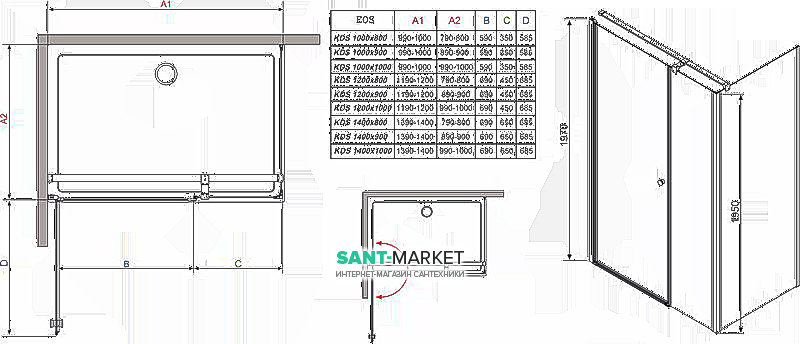 Кабіни серії Eos допускається встановлювати як на піддони, так і безпосередньо на підлогу. У разі монтажу кабінибезпосередньо на підлозі є можливість замовлення кабіни без порога. У такій ситуації нижній горизонтальний ущільнювач вище.