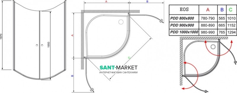 Eos PDD - напівкругла кабіна з подвійними дверима. Двері підвішені на профільних петлях, відчиняються усередину і назовні кабіни створюючи широкий і зручний вхід. Система пристінних профілів дозволяє нівелювати нерівність стінок до 10мм з кожного боку. Всі скла йдуть із покриттям Easy Clean.