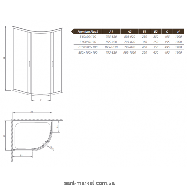 Серія Premium Plus Е характеризується класичними формами, функціональністю та естетикою технічнихрішень. До складу серії входить кілька типів кабін: напівкруглі, напівкруглі тип В, квадратні, асиметричні напівкруглі та пристінні. У кабінах використовуються подвійні підшипникові ролики, які забезпечують тиху та надійну роботу. Двері кабіни можна розфіксувати для чищення кабіни. Пристінні профіля дозволяють на нівеляцію нерівності стіни до 20мм з кожного боку. У кабінах використовується гартоване скло товщиною 5мм із покриттям Easy Clean. Доступні кольори скла: прозоре, сатинато (матове), коричневе, графітове та фабрик.