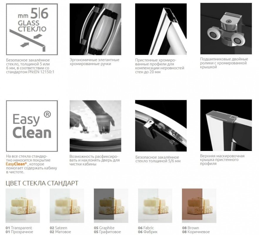 - на всі стекла стандартно наноситься покриття Easy Clean, яке допомагає утримувати кабіну в чистоті
