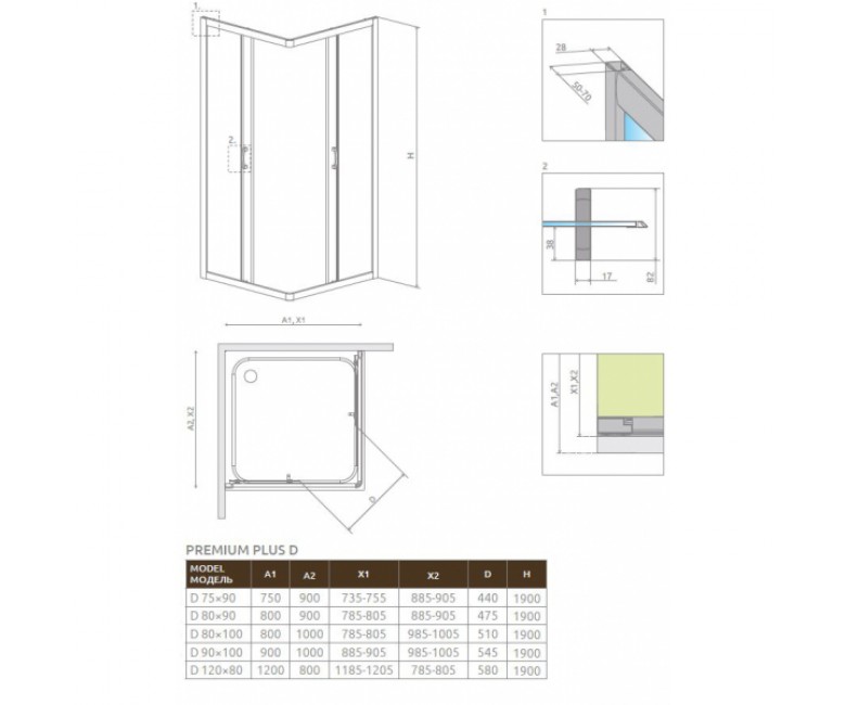 Душова кабіна Premium Plus D має класичну квадратну форму і висоту 190 см. Колекція Premium Plus характеризується популярними формами, високою функціональністю і естетикою технічних рішень. Колекція Premium Plus це хіт продажів через оптимального співвідношення ціни і якості. Кабіну Premium Plus D допускається встановлювати як на піддон, так і безпосередньо на підлогу. головнеперевага душової кабіни Premium Plus D це доступна ціна, різноманітність варіантів стекол і розмірів. При нестандартних розмірах простору для монтажу, можна використовувати розширювальні профілю +2 або +4 см для збільшення розміру душової кабіни.