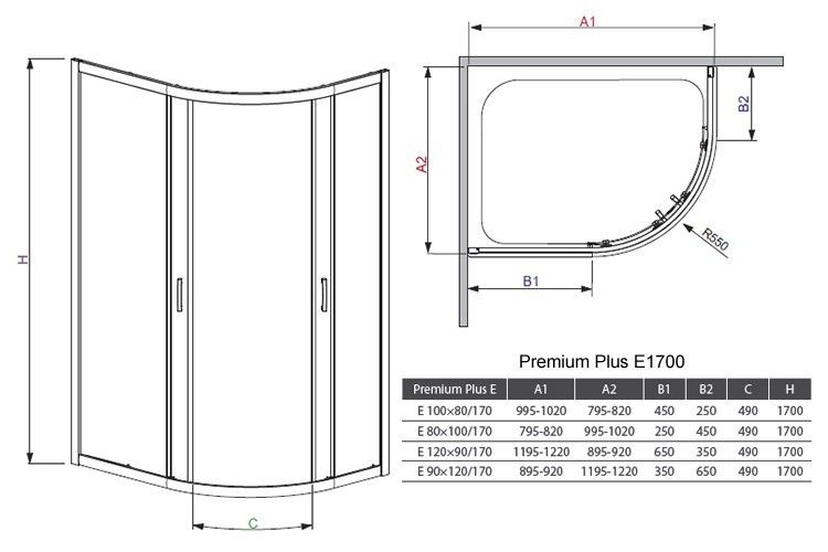 Душова кабіна Premium Plus E має радіусу асиметричну форму і доступна з висотою 170 см і 190 см. Колекція Premium Plus характеризується популярними формами, високою функціональністю і естетикою технічних рішень. Колекція Premium Plus це хіт продажів через оптимального співвідношення ціни і якості, завдяки несиметричною формі її зручно встановлювати в приміщеннях з нестандартним плануванням а універсальністькабіни дозволяє вибрати лівобічний або правобічний монтаж вже в момент установки. Кабіну Premium Plus E допускається встановлювати як на піддон, так і безпосередньо на підлогу. Головна перевага Premium Plus E це доступна ціна, різноманітність варіантів стекол і розмірів. При нестандартних розмірах простору для монтажу, можна використовувати розширювальні профілю +2 або +4 см для збільшення розміру душової кабіни.