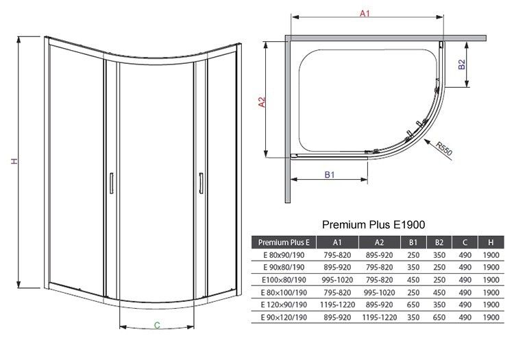 Душова кабіна Premium Plus E має радіусу асиметричну форму і доступна з висотою 170 см і 190 см. Колекція Premium Plus характеризується популярними формами, високою функціональністю і естетикою технічних рішень. Колекція Premium Plus це хіт продажів через оптимального співвідношення ціни і якості, завдяки несиметричною формі її зручно встановлювати в приміщеннях з нестандартним плануванням ауніверсальність кабіни дозволяє вибрати лівобічний або правобічний монтаж вже в момент установки. Кабіну Premium Plus E допускається встановлювати як на піддон, так і безпосередньо на підлогу. Головна перевага Premium Plus E це доступна ціна, різноманітність варіантів стекол і розмірів. При нестандартних розмірах простору для монтажу, можна використовувати розширювальні профілю +2 або +4 см для збільшення розміру душової кабіни.