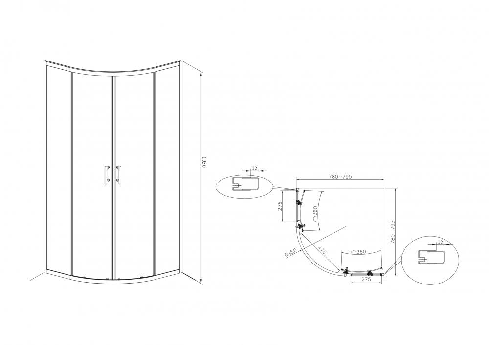1) Душова кабіна Roca Town Rondo 80х80 профіль алюміній хром прозоре скло