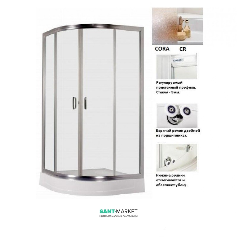 Кабіна кутова напівкругла KP4/TX5 з розсувними дверима виконана із безпечного скла завтовшки 5 мм. Ходова система складається з наборів подвійних підшипникових роликів встановлених на склі і подвійних нижніх роликів, що відстібаються. Герметичність гарантує магнітне прокладання. Зручне пересування дверей полегшують естетичні, хромовані ручки, які можна також використовувати як рушникоутримувач. Висота 190 см підвищує комфорт прийняття душу. Кабіни доступні в комплекті з піддоном та сифоном.