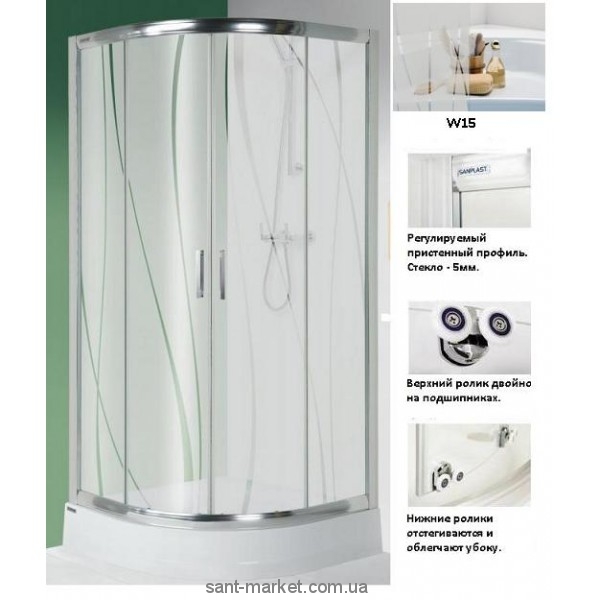Напівкругла душова кабіна з піддоном Sanplast KP4/TX5-100 з розсувними дверима виконана з безпечного скла завтовшки 5 мм. Ходова система складається з наборів подвійних підшипникових роликів встановлених на склі і подвійних нижніх роликів, що відстібаються. Герметичність гарантує магнітне прокладання. Зручне пересування дверей полегшують естетичні, хромовані ручки, які можна також використовувати як рушникоутримувач. Висота 190 см підвищує комфорт прийняття душу. Кабіни доступні в комплекті з піддоном та сифоном.