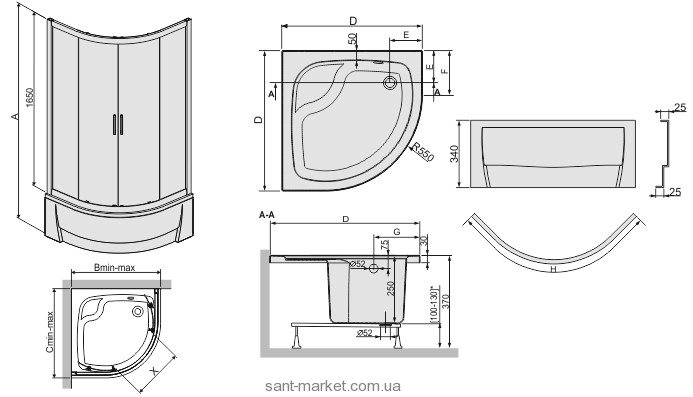 Кабіна кутова напівкругла kpl-KP4/TX5 з розсувними дверима виконується із безпечного скла завтовшки 5 мм. Ходова система складається з наборів подвійних підшипникових роликів встановлених на склі і подвійних нижніх роликів, що відстібаються. Герметичність гарантує магнітний ущільнювач. Зручне пересування дверей полегшують естетичні, хромовані ручки, яких можна також використовувати як рушникоутримувач. Кабіна висотою 202 см комплектується з акриловим душовим піддоном глибиною 30 см, зі зручним сидінням.