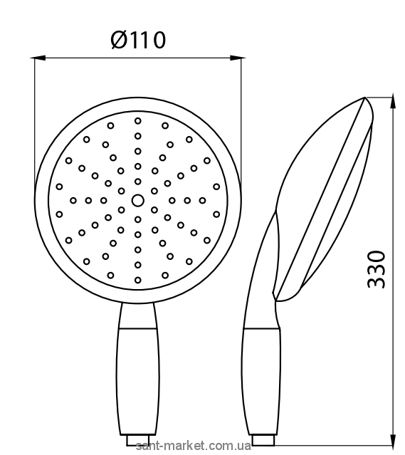 Даний виріб, що має довжину 33 сантиметри, забезпечений невеликою циліндричною ручкою, що злегка потовщується до центру. У верхній частині вона дещо згинається і плавно переходить у лійку круглої форми. При погляді збоку ця лійка нагадує елегантний еліпс, зверху коло. Бічна поверхня цієї фігури чітко зрізана по всьому периметру. Отвори для подачі води, що знаходяться в нижній частині лійки, розташовані у формі рядів, що радіально розходяться з центру, і можуть формувати три типи водяного струменя. Крім цього, представлений ручний душ також має захист від кальцієвого забруднення.