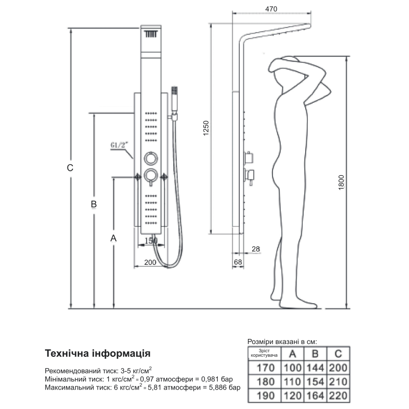 - Комплектація: ручний душ, верхній душ, душова панель, гідромасаж