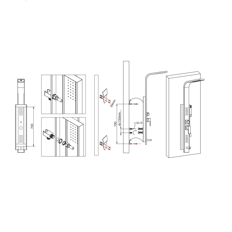 - Комплектація: ручний душ, верхній душ, душова панель, гідромасаж