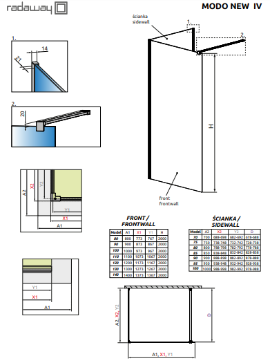 Фронтальну частину шириною 120 см та висотою 200 см можна встановлювати на піддон 1173 мм.
