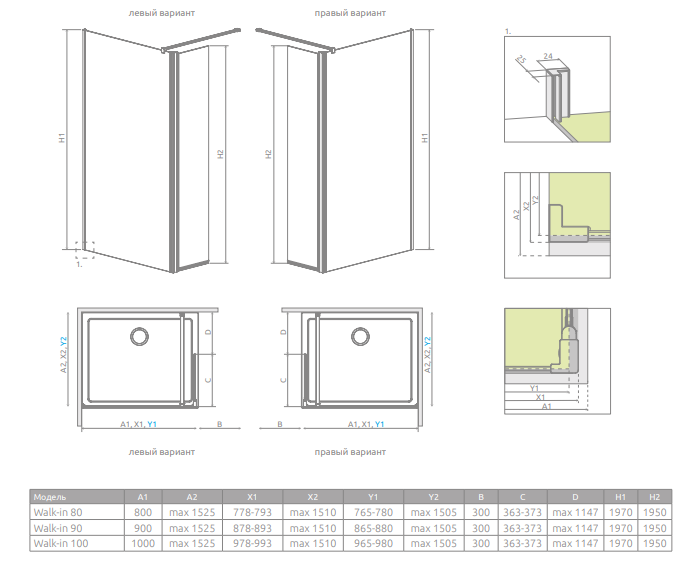 - Скло кріпиться до стіни за допомогою пристінних профілів (з регулюванням).