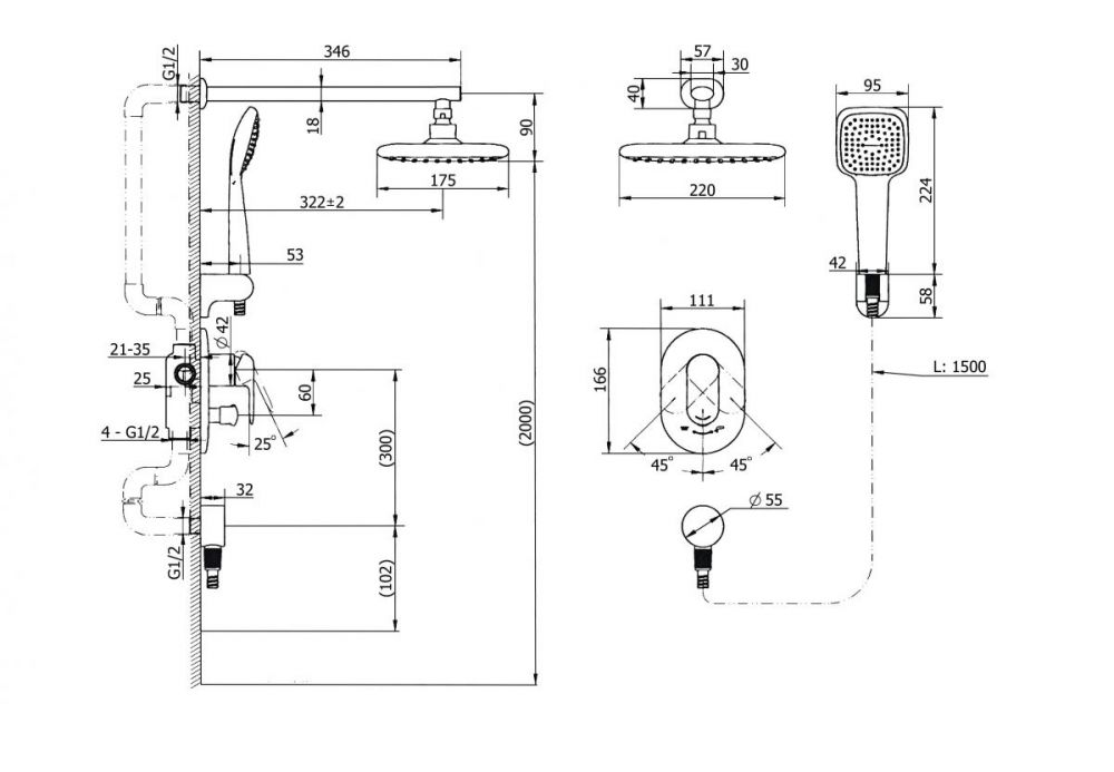 Комплектація: змішувач; верхній душ; ручний душ; душовий шланг; держатель для ручного душа