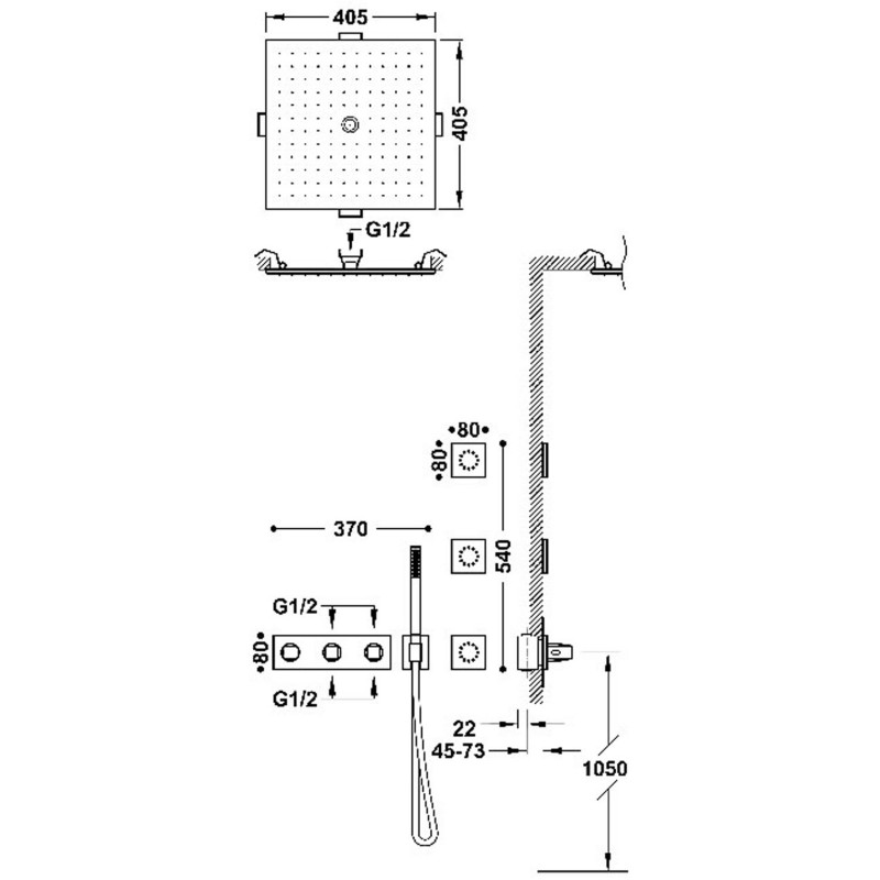 - верхній душ прихованого монтажу з нержавіючої сталі 405х405 мм з 2 типами струменя (дощ/вільний) потік)