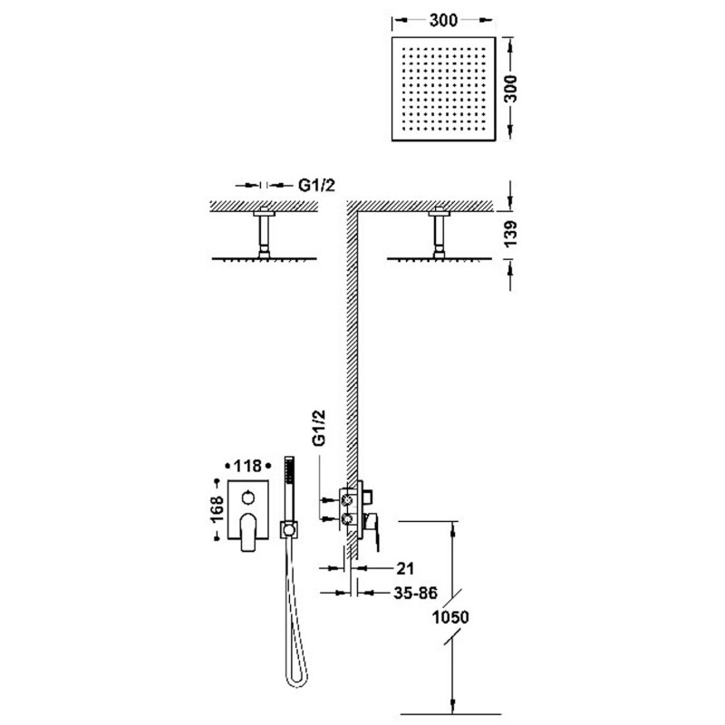 - Стельовий кронштейн з регульованою латунною душовою насадкою: 300x300 мм