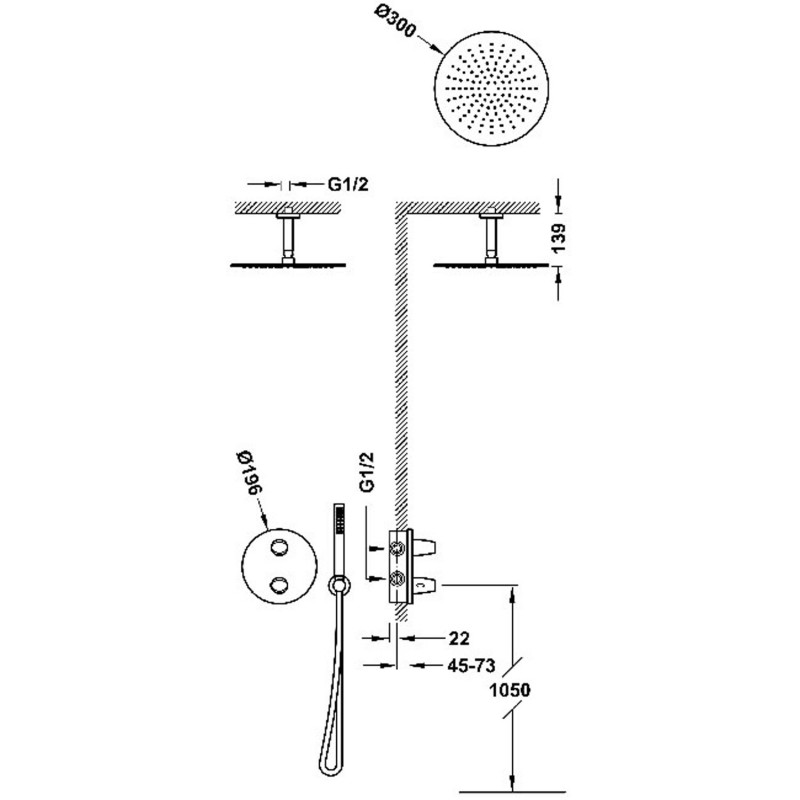 - Стельовий кронштейн з регульованою душовою лійкою з нержавіючої сталі: Ø 300 мм
