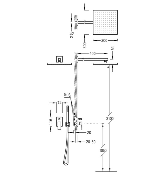 - Душова система з одноважільним вбудованим змішувачем з затвором і регулятором потоку