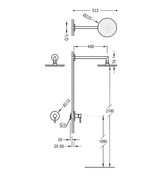 - Незнімний душ Ø 225 мм з шарніром