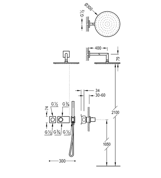- Вбудована термостатичні система для душа з затвором і регулятором потоку (2 канали)