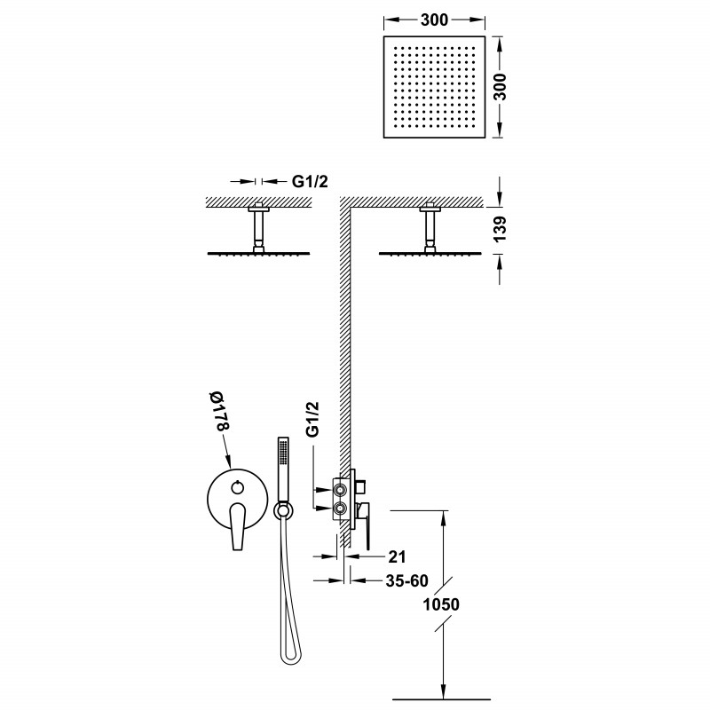 3) Незнімний душ INOX 300x300 мм із шарніром
