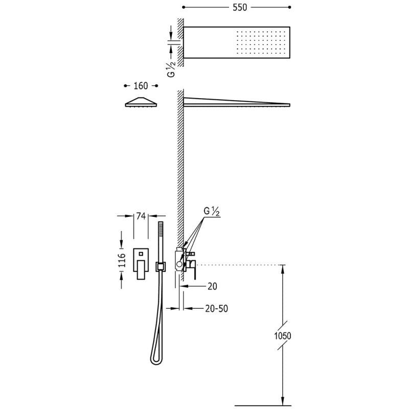 Верхній душ INOX 160х550 мм