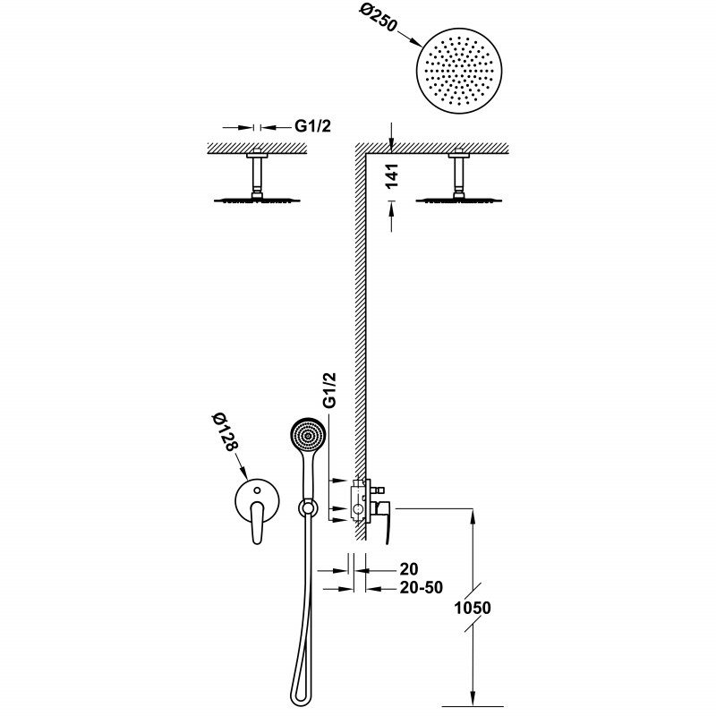 - Незнімний душ Ø 250 мм із шарніром. Матеріал нержавіюча сталь