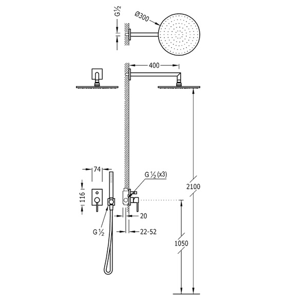 - Незнімний душ з латуні Ø 300 мм з шарніром