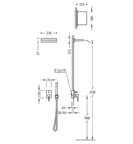- Душова система з одноважільним вбудованим змішувачем з затвором і регулятором потоку