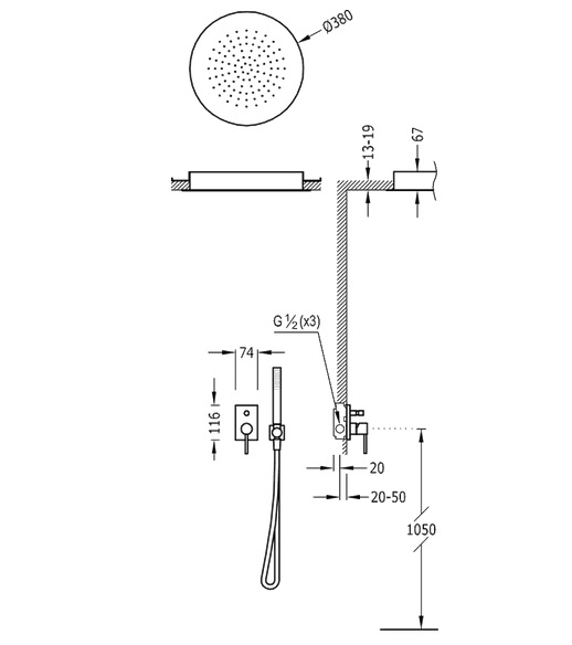 - Душова система з одноважільним вбудованим змішувачем з затвором і регулятором потоку