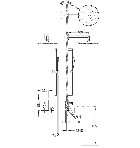 - Душова система з одноважільним вбудованим змішувачем з затвором і регулятором потоку