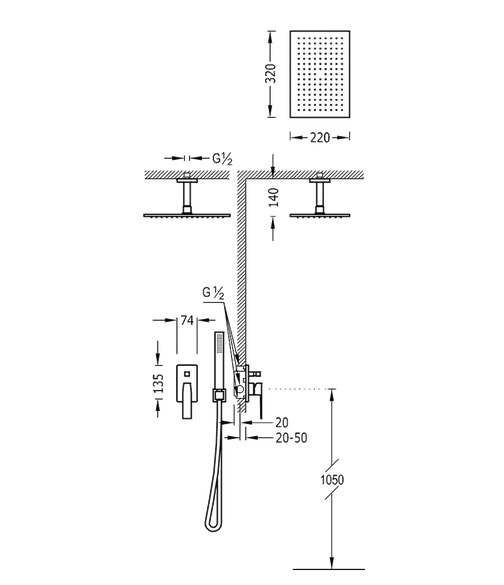 - Незнімний душ 320x220 мм. короткого типу. Латунь.