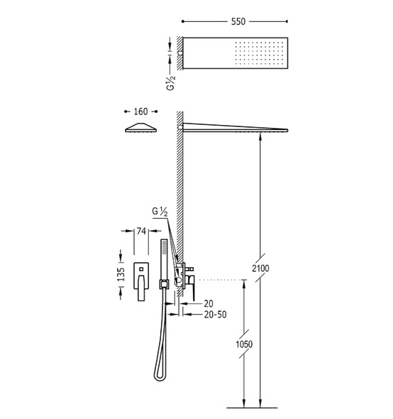 - Розпилювач душовою INOX настінний з нержавіючої сталі 160х550 мм.