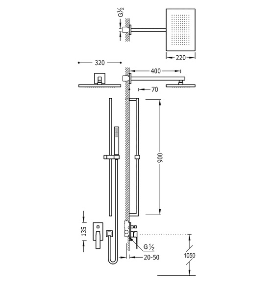 - Душова система з одноважільним вбудованим змішувачем з затвором і регулятором потоку.
