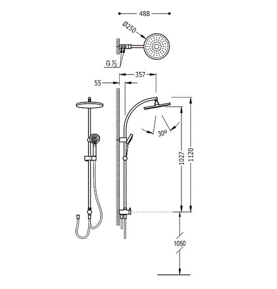- Діаметр лійки верхнього душа, мм: 250