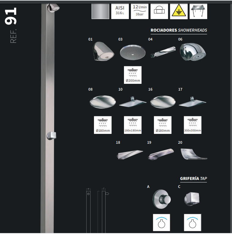 AQA душ на відкритому повітрі з нержавіючої сталі з вбудованим якорем для міцного кріплення до підлоги. Функціональний і сучасний дизайн в відповідності з останніми тенденціями в зовнішній обробці, він включає в себе самі передові технології, які гарантують експлуатацію і тривалий термін служби. Душ необхідний для будь-якого будинку з басейном, так як він допомагає вам видаляти з шкіри хімічні речовини після купання в хлорованій воді.