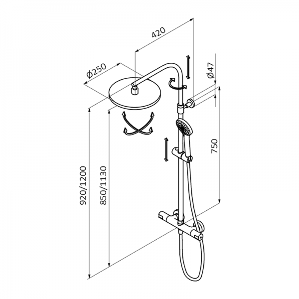 - Форма лійки верхнього душа: кругла (Ø 250 мм, 1 режим)