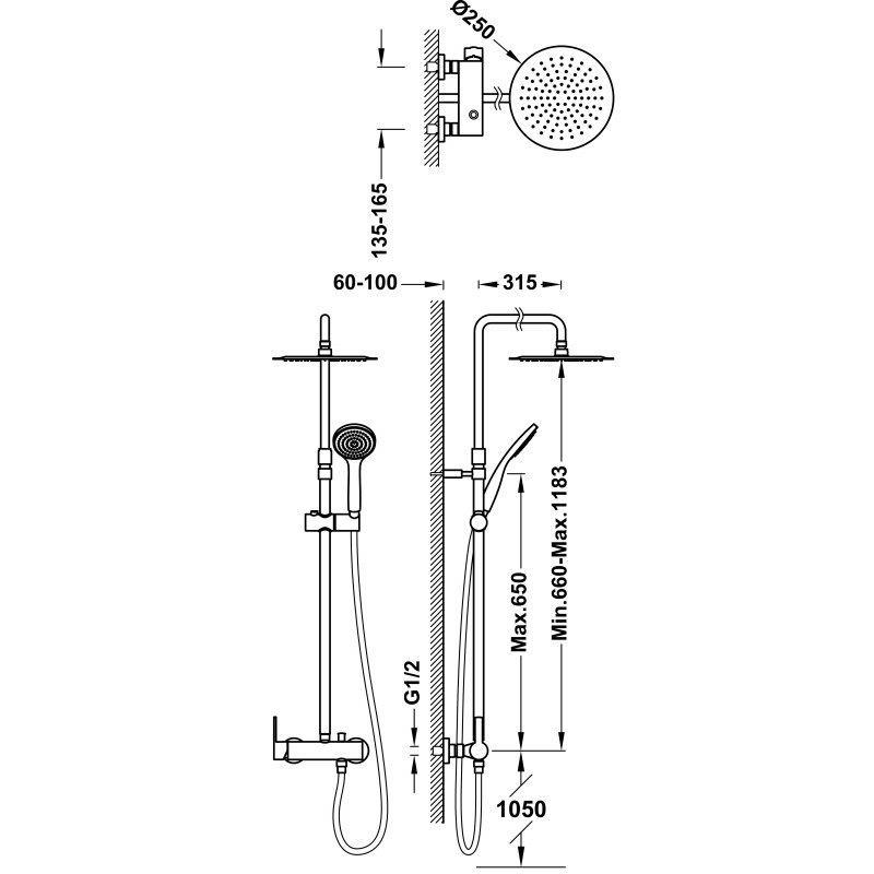 - Незнімний душ Ø 250 мм із шарніром. Матеріал нержавіюча сталь